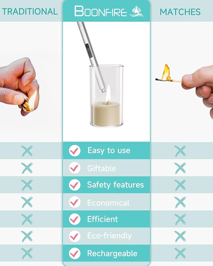 Boonfire Candle Lighter, Electric Rechargeable Arc Lighter with LED Battery Display Portable USB Charging Flame-Less Windproof Lighters for Light Candles Gas Stoves Camping Barbecue(Silver)