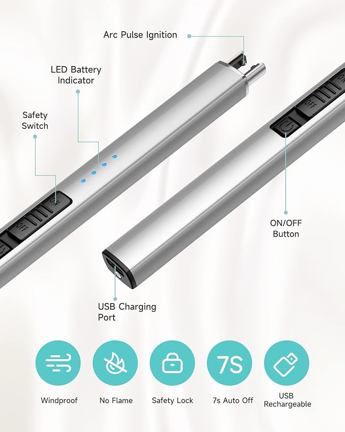 - 【Electronic Candle Lighter】Candle lighter has ARC technology. Made of zinc-alloy, durable and fast to cool down after use. Electric lighter without gas required, no fluid required, no flame. The windproof and splash-proof design of the electric arc lighter ensures that you can easily use it under any weather conditions
