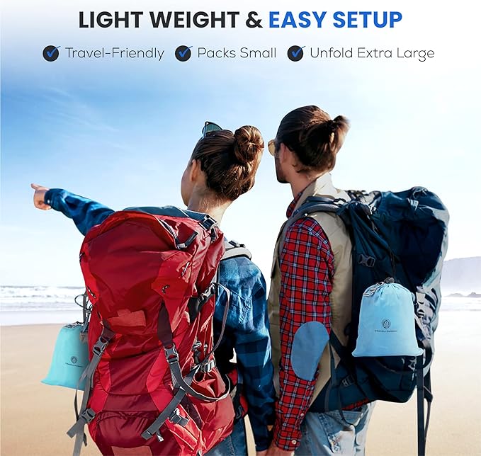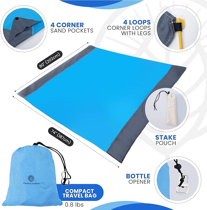 - Large Size For Up to 6 People: It's an extra large beach blanket (80"x74"), but it's also easy to stow away. Our beach mat sheet rolls into a compact size that fits in its storage sack. It's a lightweight and packable outdoor blanket, so you'll have no problem tossing it in the trunk for your next trip! The large area of this folding mat makes ideal outdoor play mat or portable camping mat for the family