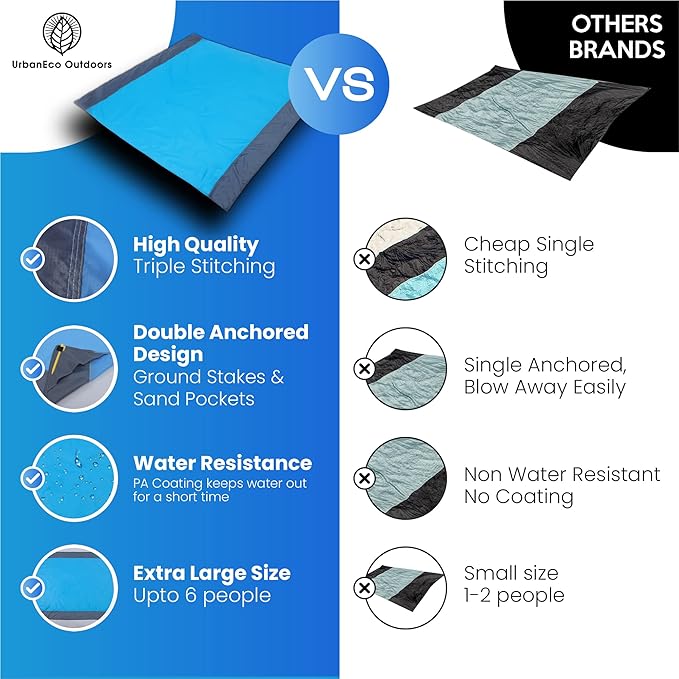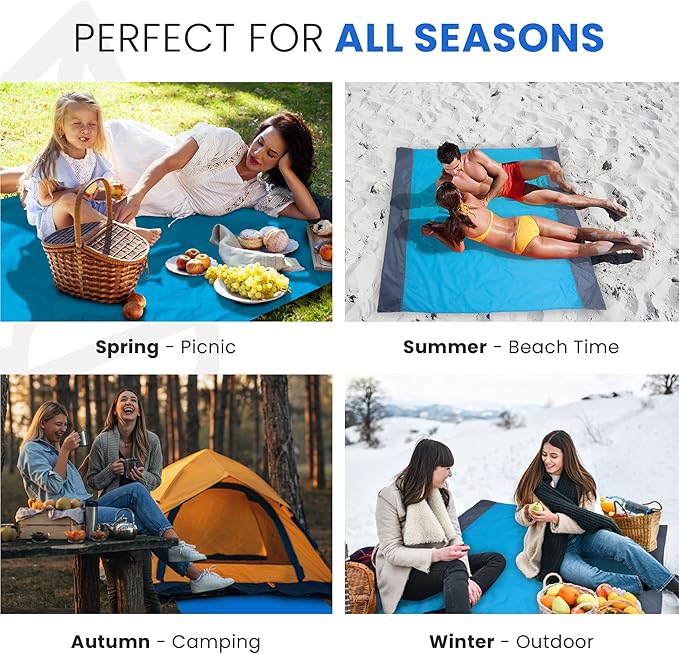 - Quick Dry & Water Resistant: This sheet styled oversized beach blanket keeps you clean and dry in the outdoors. Though it's not 100% waterproof, with a water resistant outdoor blanket like ours, you'll keep water at bay, so you enjoy your day with our water resistance blanket. Our waterproof beach mat sandproof is versatile in design. Perfect as an outdoor picnic blanket, sand free beach mat or practical solution to take to festivals, concerts, gatherings and vacations