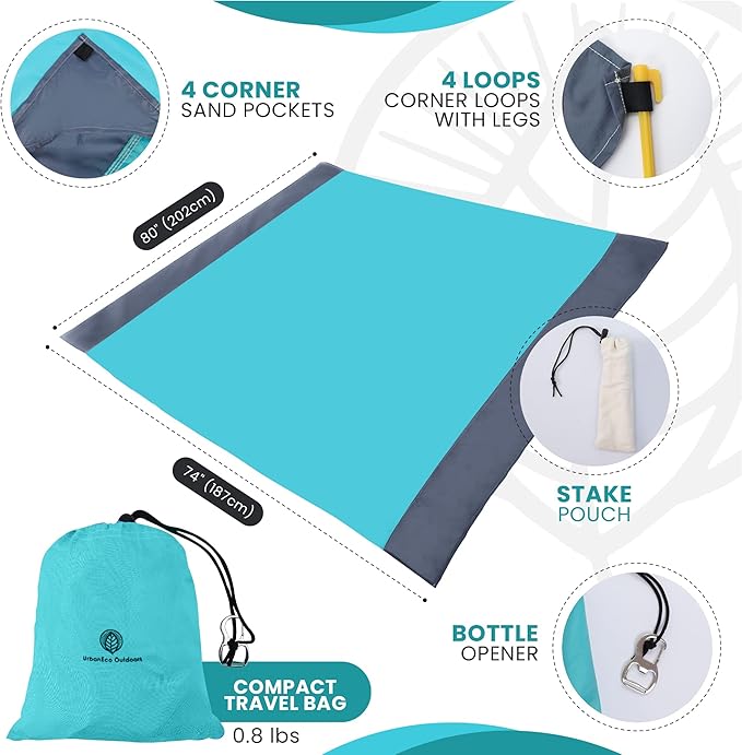 - Multipurpose Use and A Great Gift: Our oversized outdoor waterproof sandproof blanket can be used for camping, hiking, park, picnic, garden, backyard, and all year round. It is also an awesome gift for outdoor enthusiasts and travellers. Our no sand beach mat is double anchored with 4 stakes and 4 anchor pockets that will weigh it down on breezy day. Your value pack comes with 1 stake pouch for storing the stakes and 1 bottle opener, as free bonuses.