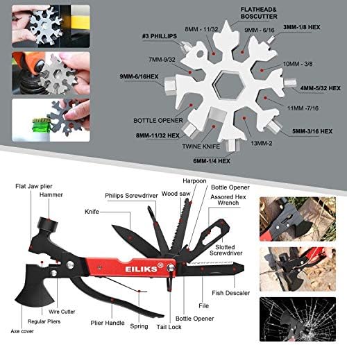 - Included Components : 14 in 1 multifunction hatchet, 18-in-1 snowflake multi tool, multifunctional spork, survival bracelet, survival wire saws, fire fighting stone, tactical pen, flashlight, emergency blanket, SOS whistle, hooks, parachute cord, portable case 14 in 1 multifunction hatchet, 18-in-1 snowflake multi tool, multifunctional spork, survival bracelet, survival wire saws, fire fighting stone, tactical pen, flashlight, emerge… See more