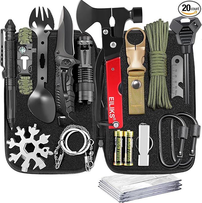 - Must Have 20 in 1 Emergency Survival Gear Kits: 14 in 1 multifunction hatchet, 18-in-1 snowflake multi tool, multifunctional spork, survival bracelet, survival wire saws, fire fighting stone, tactical pen, flashlight, AA battery, emergency blanket, bottle hanging buckle, SOS whistle, 2 hooks, parachute cord and upgrade portable case.