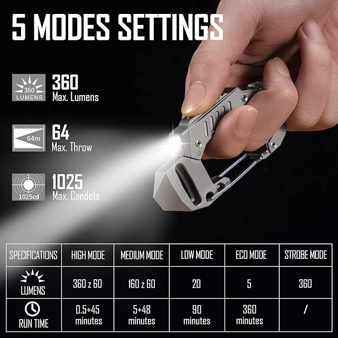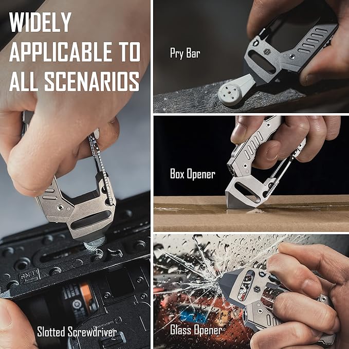 - 7 TOOLS IN 1 CARABINER: This multitool carabiner can be used as a EDC keychain, LED flashlight, bottle opener, slotted screwdriver, pry bar, box opener, also can be used as a glass breaker. It’s a utility keychain tool that great for daily use