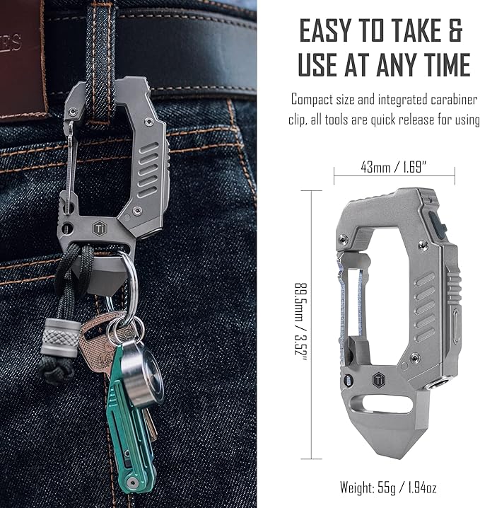 - MADE FOR EVERYDAY CARRY: Compact size of 3.52” x 1.69” x 0.75”, weight only 1.94oz makes it the perfect keychain accessory, conveniently attach to key rings or other EDC tool. Designed with a handy carabiner clip that can be attached to pants loop, backpack, carry bag, or camping bag for easy access, all tools are quick release for using