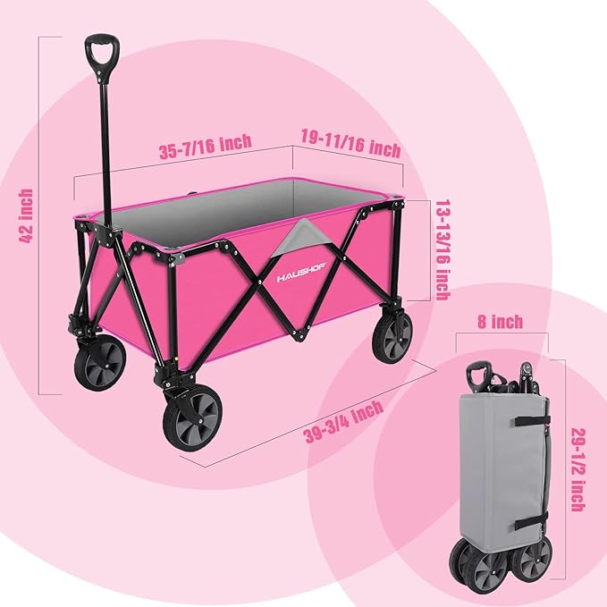HAUSHOF Heavy Duty Collapsible Wagon, Folding Outdoor Utility Wagon, Camping Garden Beach Cart with Universal Quick Release Wheels, Adjustable Handle, 176 lbs Load Capacity, Pink
