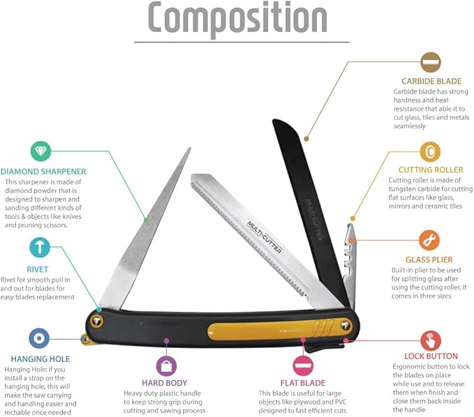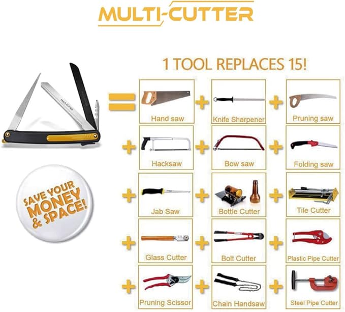 - 🛠️【ECONOMIC】 - Multi Cutter save your money! Too many kinds of saws for home, workshops, or fields! Multi Cutter replaces Hacksaw, Pruning, Folding, and Jab Hand Saws, Bottle, Tile, Glass, Bolt, Steel Pipe, and Plastic Pipe Cutters, Pruning Scissor Chain Handsaw.