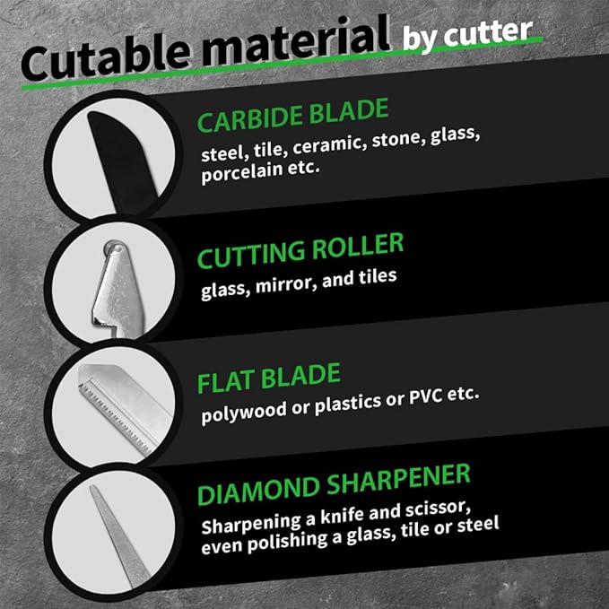 - Included Components : Carbide Blade, Cutting Roller Blade, Flat Saw Blade, Diamond Sharpener