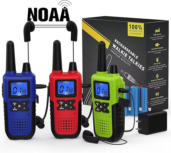 3 Walkie Talkies for Adults Long Range Walkie Talkies Rechargeable - Long Distance Walkie Talkies 3 Pack Family 2 Way Radios Walkie Talkies with Earpiece and Mic Set USB Charger Battery NOAA Alert