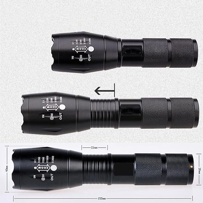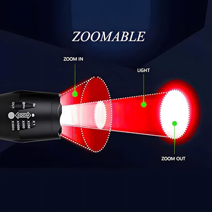- 💡[Zoomable Flashlight] -- Zoom in for floodlight, zoom out for spotlight. Zoom in flood light could reach 200 yard, zoom out spotlight up to 350 yards long.Adjustable focus flashlight meets the illumination of different distances and areas