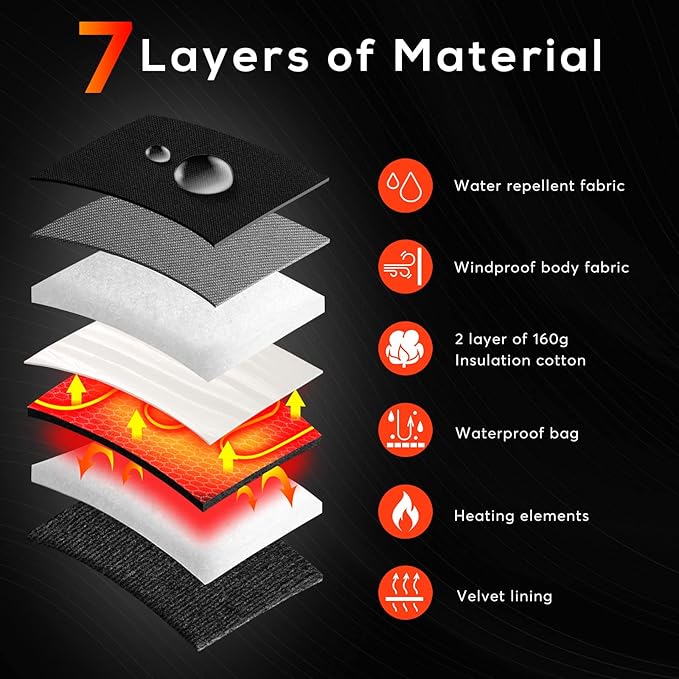 - 【Superfine Fibre & 7 layers of Materials】The palm part is made of superfine fibre, non-slip and more wear-resistant than others' PU material, leading to longer service life. 7 layers material ensures enough warmth. Velvet lining is comfortable to wear with performance upgrade. Besides, diving materials in battery insulation pocket ensure stronger temperature-locking effect.