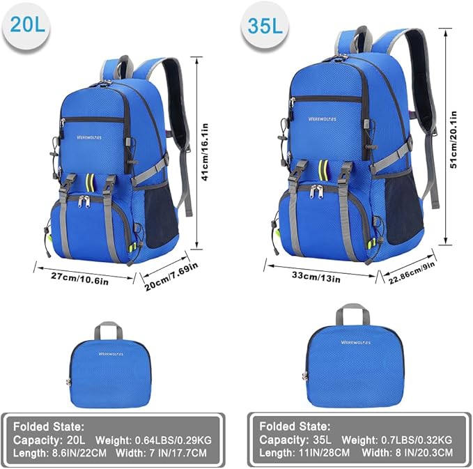 - Lightweight and easy to fold: WEREWOLVES foldable backpacks give you a choice of 20 liters and 35 liters in different capacities. 35L:Collapse size only 9.8 x 8.6 x1.1 inches. Unfold size is 20.8 x 12.6 x 9 inches. Weight:0.8lb 20L:Collapse size only 6.7 x 5.5 x1.1 inches. Unfold size is 16.1 x 10.6 x 7.9 inches. Weight:0.7lb Decompress your trip!