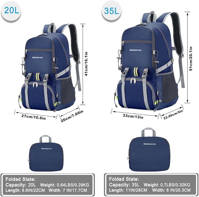 • Lightweight and easy to fold: WEREWOLVES foldable backpacks give you a choice of 20 liters and 35 liters in different capacities. 35L:Collapse size only 9.8 x 8.6 x1.1 inches. Unfold size is 20.8 x 12.6 x 9 inches. Weight:0.8lb 20L:Collapse size only 6.7 x 5.5 x1.1 inches. Unfold size is 16.1 x 10.6 x 7.9 inches. Weight:0.7lb Decompress your trip!