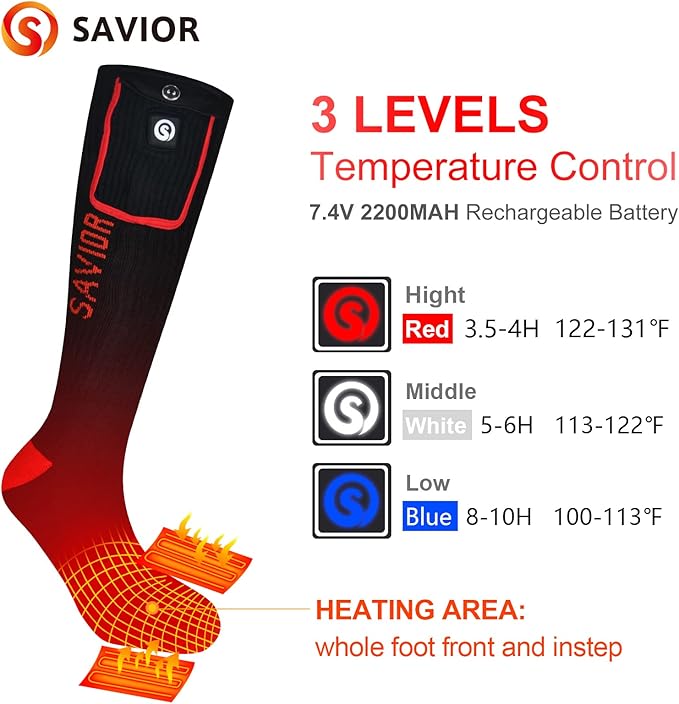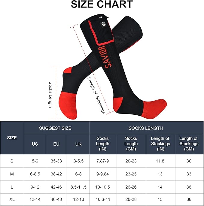- 【Heating Elements Covers Instep and Toes Area】Rechargeable heated socks upgraded to use far infrared carbon fiber heating elements which can stimulate the blood circulation. Fast heating in 30 seconds, keep your feet warm and cozy.