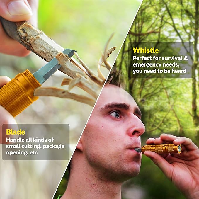 - All-In-One Gadget: This All-In-One Multitool contains of 6 different small tools, including a Flashlight, Lighter, Stainless steel glass break tip, Whistle, Knife blade and Compass. Every single tool handle the job well and only take a small space. All small tools combined into this compact tool kit. The whole item is like a pen in length, pocket size, sturdy and handy. A perfect small EDC Gear