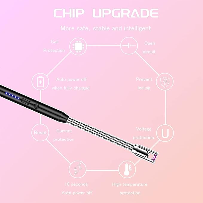 - ♚【SAFETY PROTECTION】The candle lighter has safety protection design inside and double switch to ensure safety use.Continuous ignition for 7 seconds or don't ignite the candle lighter over 10 seconds or heavy use, the candle lighter will automatically power off to protect the lighter and save battery power.Close and reopen the switch to reuse it.Our rechargeable lighter is with flexible gooseneck keep your hand away from dirty or burn yourself. It's a safe electronic lighter
