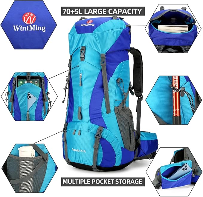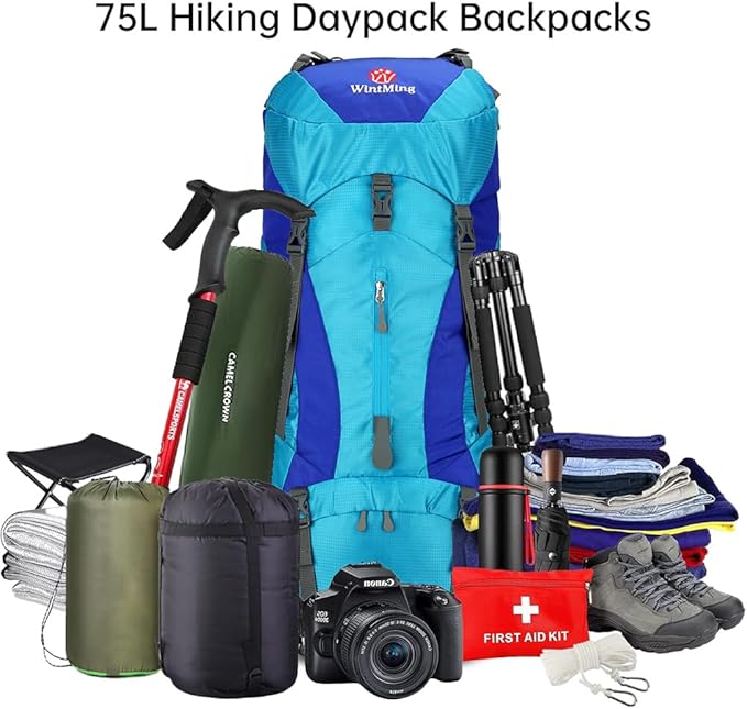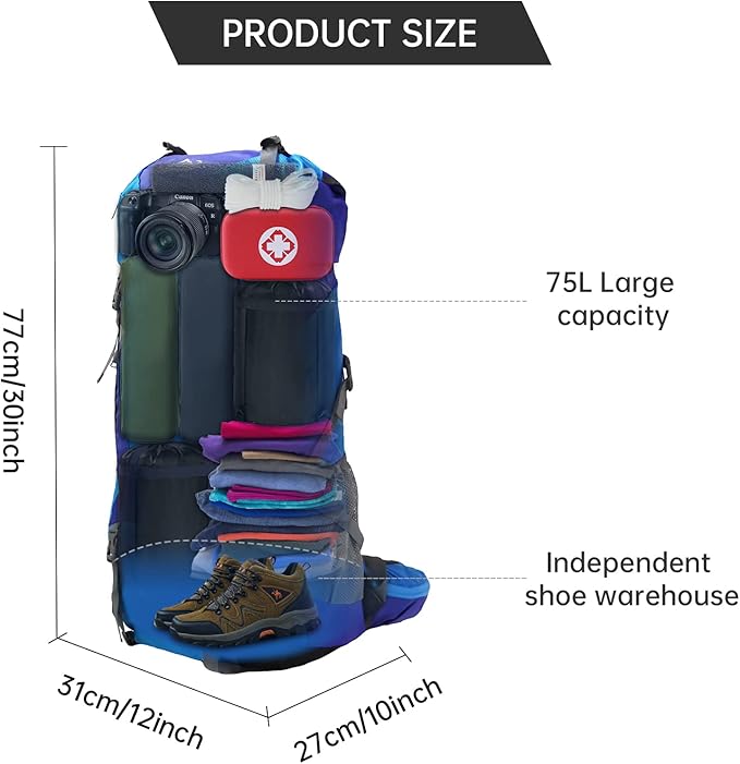 - Large Capacity Backpack: Travel backpack with 75L storage space(30 * 12 * 10inch), easily hold all your camping and hiking essential stuffs, multi-compartments design are convenient enough to help you further organize things, and designed a separate shoe warehouse.
