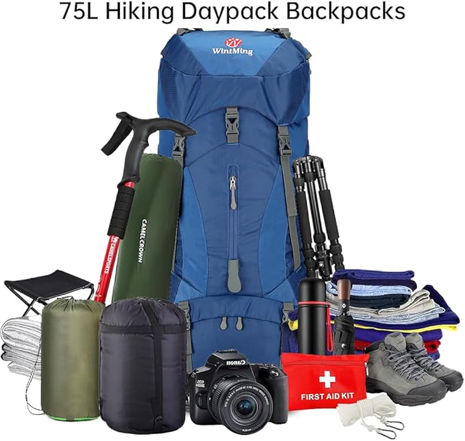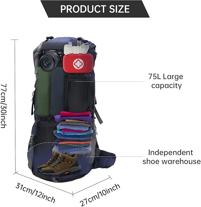 - Large Capacity Backpack: Travel backpack with 75L storage space(30 * 12 * 10inch), easily hold all your camping and hiking essential stuffs, multi-compartments design are convenient enough to help you further organize things, and designed a separate shoe warehouse.