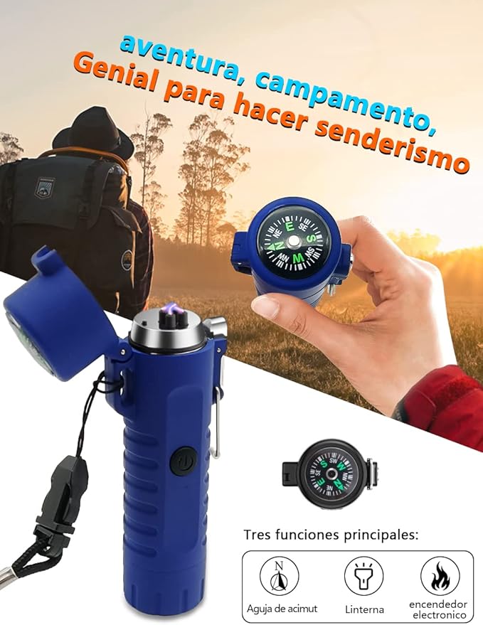- 🧭【3 IN 1 ELECTRIC LIGHTER】This electric Lighter camping with two other functions, 3 mode LED flashlight and precise compass.Compass is on the top of the cap and the flashlight is at the bottom of the electronic lighter.The flashlight and lighter share a same switch.