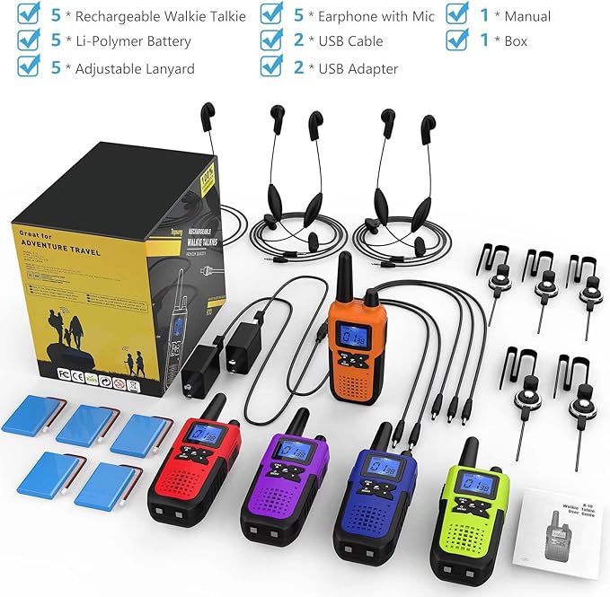 - Included Components : Walkie Talkies for Adults Working, Kids Playing, High-Capacity Batteries for Extended Talk Time, USB Charger Y Cable for Fast Simultaneous Charging, Original Earpiece and Mic Sets for Private Chats, Belt Clips & Adjustable Lanyards for Ease of Carry Walkie Talkies for Adults Working, Kids Playing, High-Capacity Batteries for Extended Talk Time, USB Charger Y Cable for Fast Simultaneous Charging, Original Earpiece and Mic Sets for Private Chats, Belt Clips & Adjustable Lany… See more