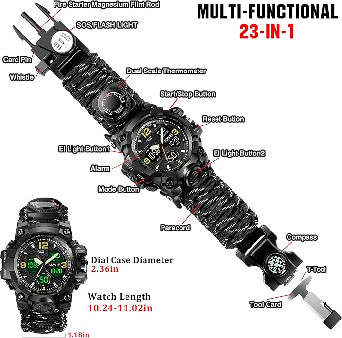 23-in-1 Survival Military Digital Watch, Mens Tactical Multi-Functional and Adjustable Wristband Outdoors Waterproof Sports Dual Dial Watches with Compass Paracord Band