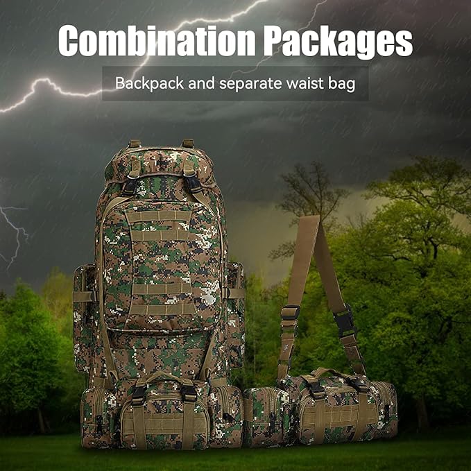 - Separate Belt Bag : 100l molle pack has an independent belt bag that can be used as a shoulder bag or messenger bag.It is very convenient to carry, you can store some things you need at any time,like water,flashlight ,Cell phone,Headphones,sunglasses,etc.