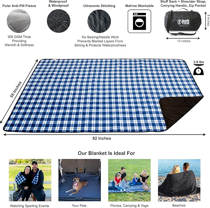 BRAWNTIDE Large Outdoor Waterproof Blanket - Quilted, Extra Thick Fleece, Warm, Windproof, Sandproof, Includes Stuff Sack, Shoulder Strap, Ideal for Beaches, Picnics, Camping, Stadiums, Dogs, Car