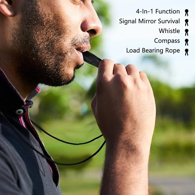 - 4-In-1 Function: our signal mirror contains a total of 4 functions, signal mirror survival, whistle, compass, load bearing rope, which are multifunctional outdoor distress tools; With built in precise aiming system, it is ideal for outdoor survival activities, long distance communication in the field, sending reflective survival mirror signals, etc