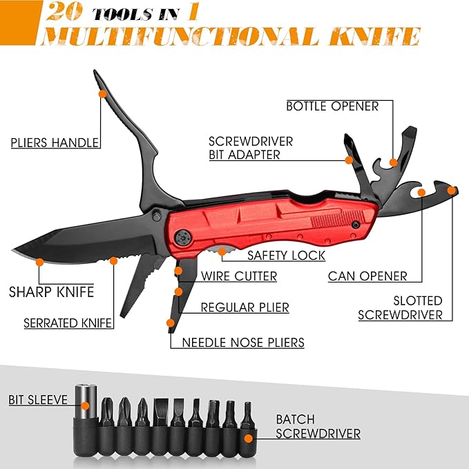 - 【Integrated Tools】: 20 in 1 multi-functional knives, including 9-in-1 screwdriver head set, pliers, sharp knife, serrated knife, bottle opener, safety lock, can opener and 1 multi-purpose tool box. Whether you are camping, hiking, fishing and doing other outdoor activities, or home maintenance, furniture, etc., this multifunctional knife can meet your daily needs.