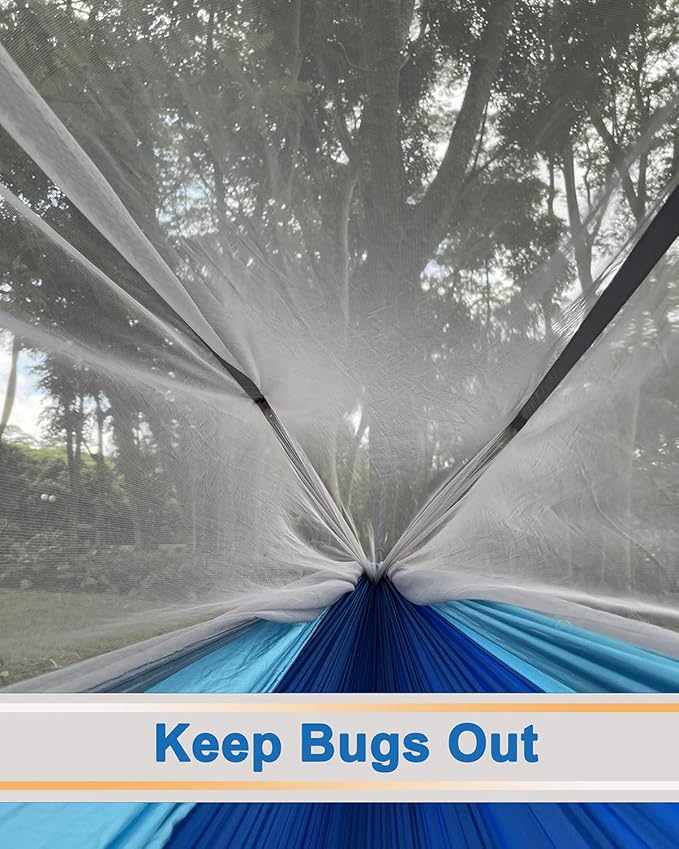 - Upgraded Camping Hammock Installation: Say goodbye to complicated installation method,our camping hammock has 2 adjustable ropes with hook,just carry the rope then connect the hook with tree straps.Upgraded net is more dense and durable which can effectively stop the bites and harassment of insects.Extra large space can give you maximally comfortable,have a snuggle, stretch out or even have your pets with you in our hammocks