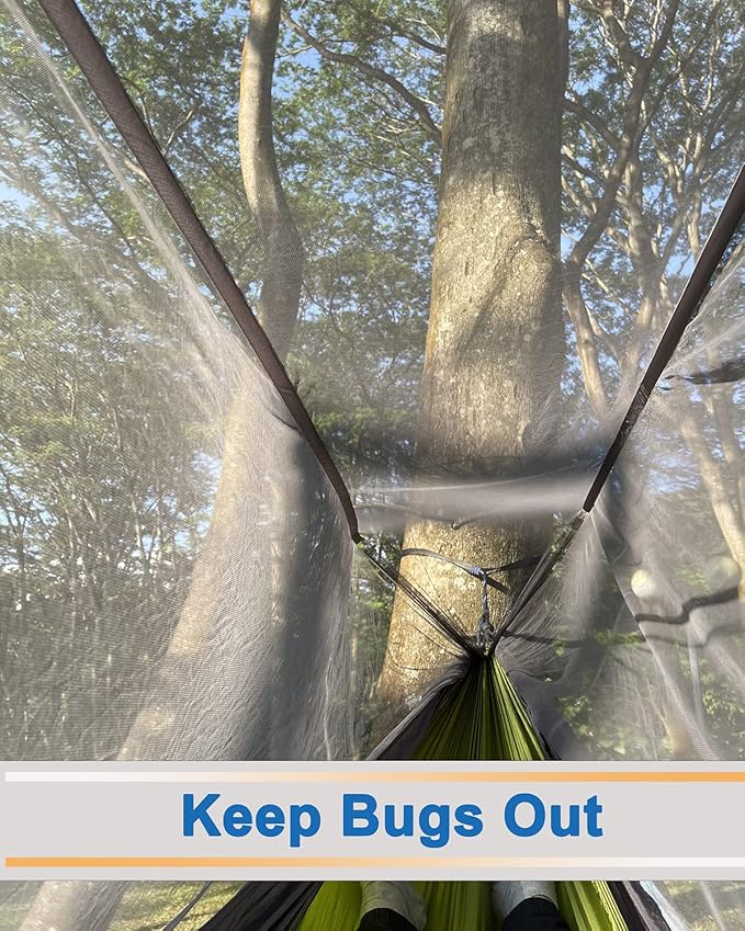 - Upgraded Camping Hammock Installation: Say goodbye to complicated installation method,our camping hammock has 2 adjustable ropes with hook,just carry the rope then connect the hook with tree straps.Upgraded net is more dense and durable which can effectively stop the bites and harassment of insects.Extra large space can give you maximally comfortable,have a snuggle, stretch out or even have your pets with you in our hammocks