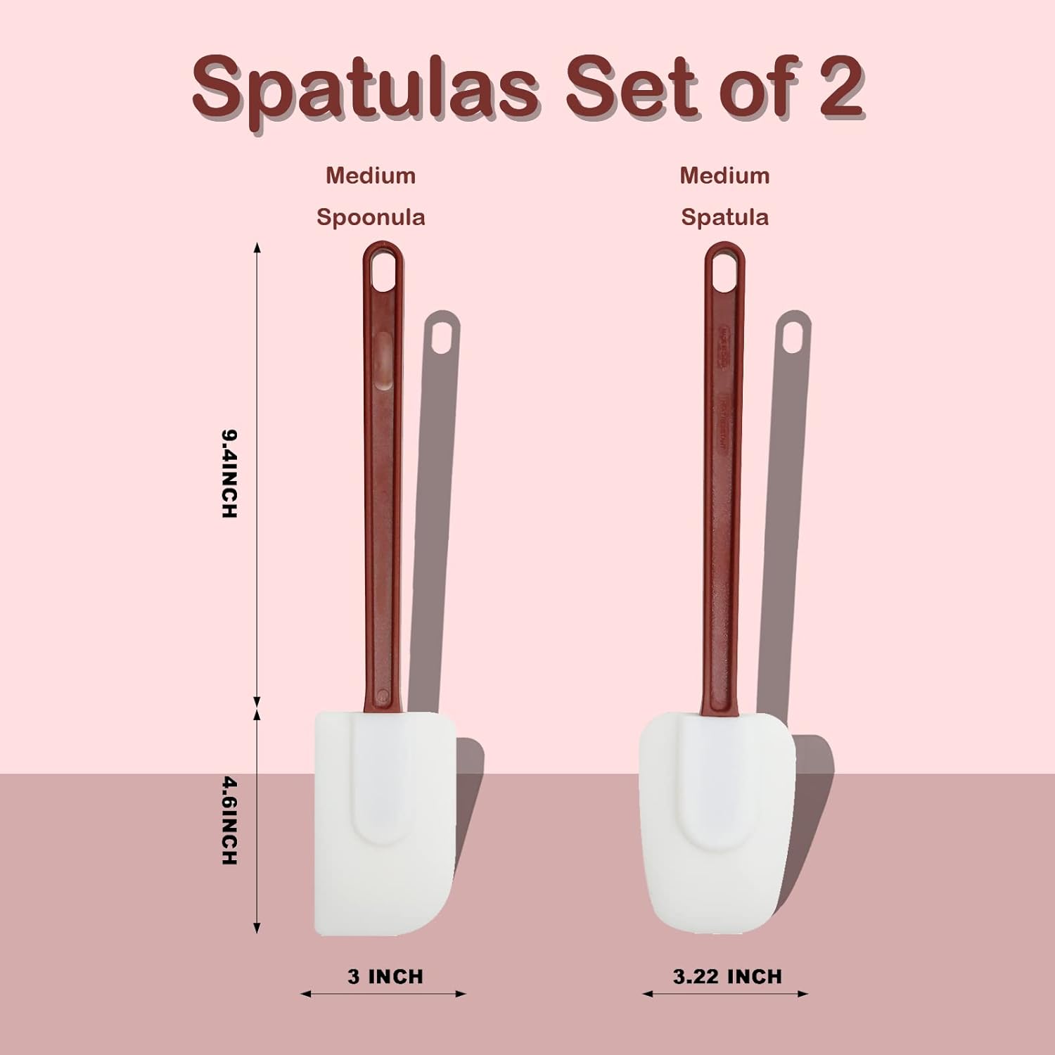 - 【Silicone Spatula Set】 The product contains two silicone spatulas, one is flat and one is spoon type head, which can fit any shape of container. There are three different sizes of 9.5"/13.5"/16.5" for you to choose from, which can meet your different needs. The 9.5" rubber spatula can be used in your bowl, the 13.5" is suitable for frying and cooking, making cakes in a family of 3-5, and the 16.5" can be used in large containers, such as large pots and pans in commercial kitchens