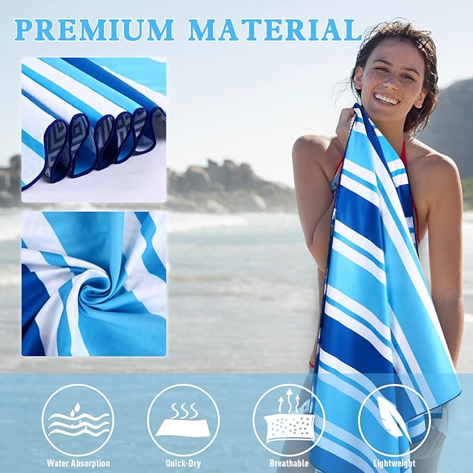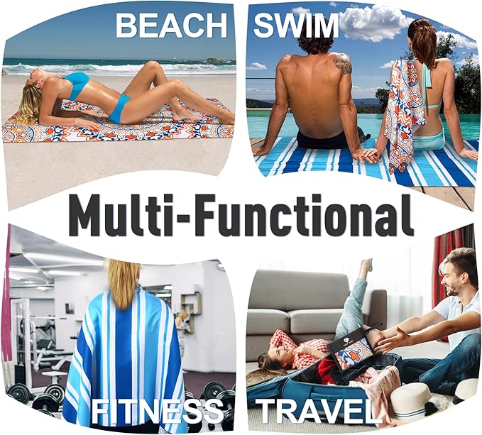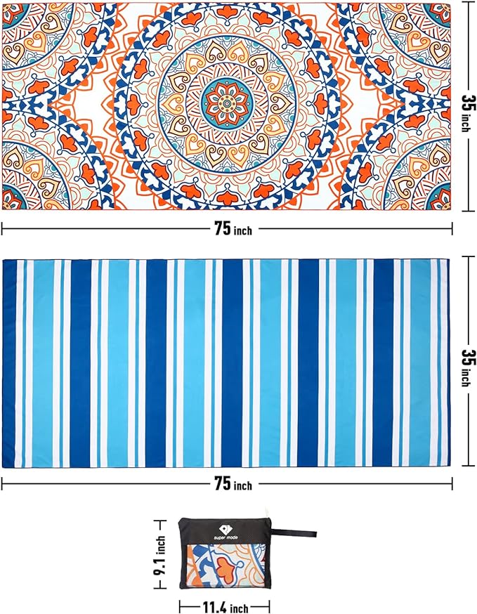 - 【Multi-Purpose Beach Towel 】The beach towel set has an unfolded size of 75"x35", which is ideal for beach recreation, swimming pools, spas, saunas, gyms, yoga, travel, camping, and picnics. It is also ideal as indoor swimming towels.