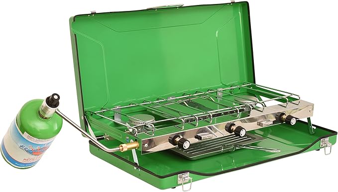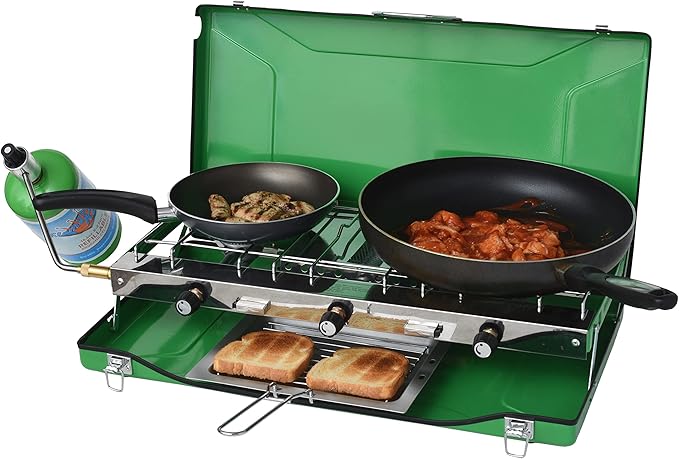 Flame King YSNBBQ-136M 3-Burner Portable Camping Stove Grill w/Toast Tray, Great for Outdoor Cooking, Backpacking, Compatible with 1LB Propane Gas Bottle