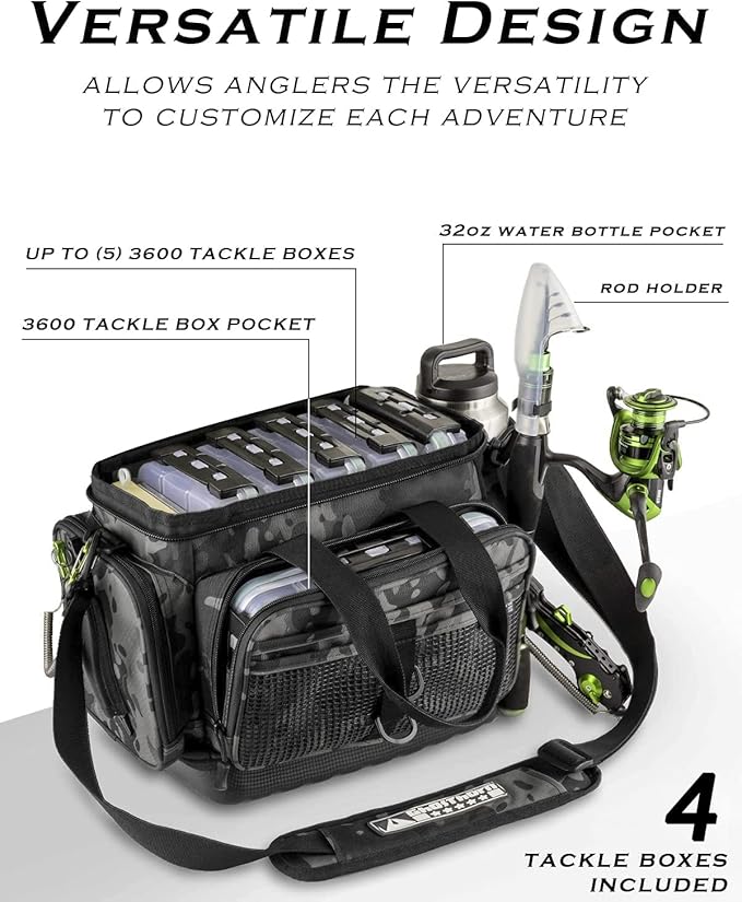 - 【Professional Design】This tackle bag is designed with a rod holder which means you can use it hands free when you’re on the move. There are plenty of D-Rings for carabiners to attach your fish dehooker tools, clippers, knife etc. 4 x pack 3600 trays can be customized with pre-cut dividers. The padded strap makes it incredibly comfortable, so you won’t get a sore shoulder. The compression molded plier holder gives you quick access when fish are on the line.