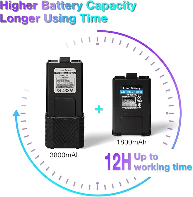 - [Lasting Service Life] The radio set comes with 2 BL-5L 3800 mAh batteries and 2 regular 1800 mAh batteries. You can switch batteries with confidence to maintain long-lasting use. The rechargeable two way radio would work well with your other GMRS units. You can share the whole set with your family and friends when you are hiking or camping.