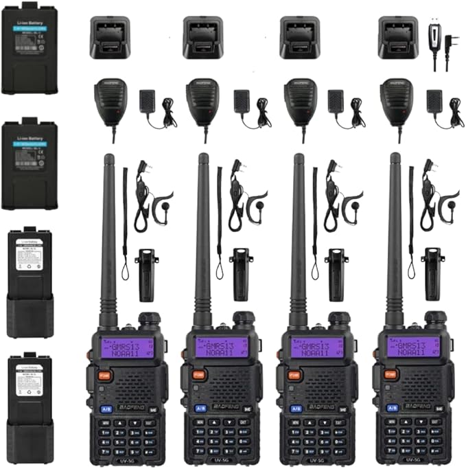 - [Brand New Set] These long range GMRS radios are ready to go. Right out of the full set in one box: 4 handheld radios + 4 speaker mics + 4 rechargeable batteries + 1 programming cable. FCC ID: 2AN62-UV5G. A GMRS license is required. UV-5G is the GMRS version of the classic UV model.