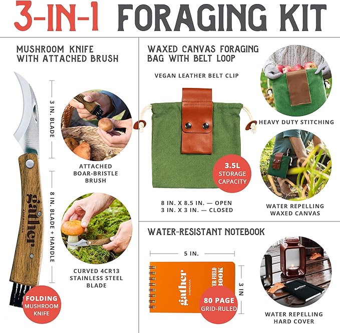 - 🍄 THE ULTIMATE MUSHROOM FORAGING KIT: Embark on your mushroom hunting adventure with our comprehensive kit. Including a mushroom foraging bag, a mushroom knife with brush, and a waterproof field journal, it's everything you need for a successful hunt.