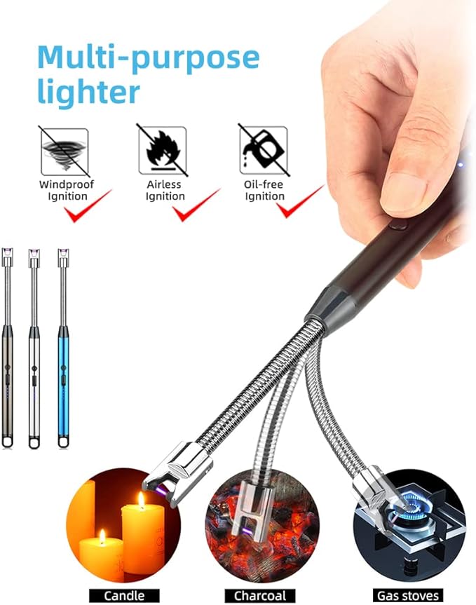 - 【Windproof And Flameless】:The electric lighter adopts plasma arc windproof and flameless technology,no flame,no butane, no trouble. The candle lighter is suitable for strong wind and damp environment, the electric candle lighter is an ideal lighting tool for you to use outdoors.Compared with other arc igniters,the noise is lower.