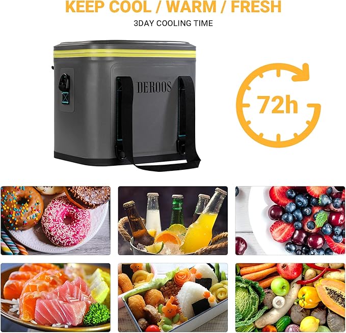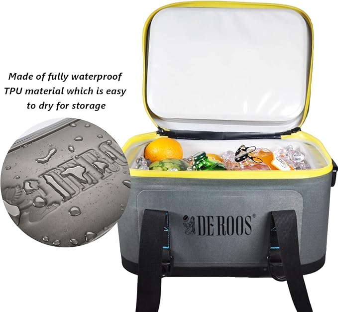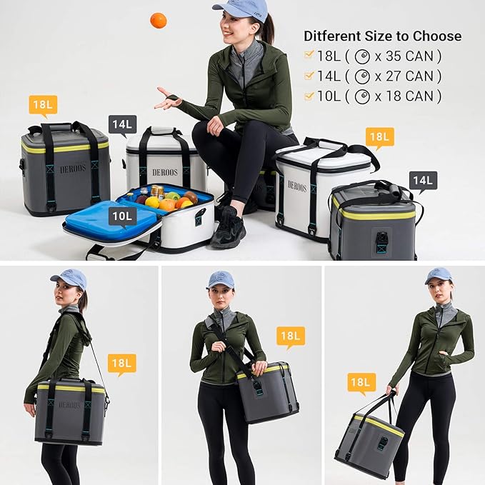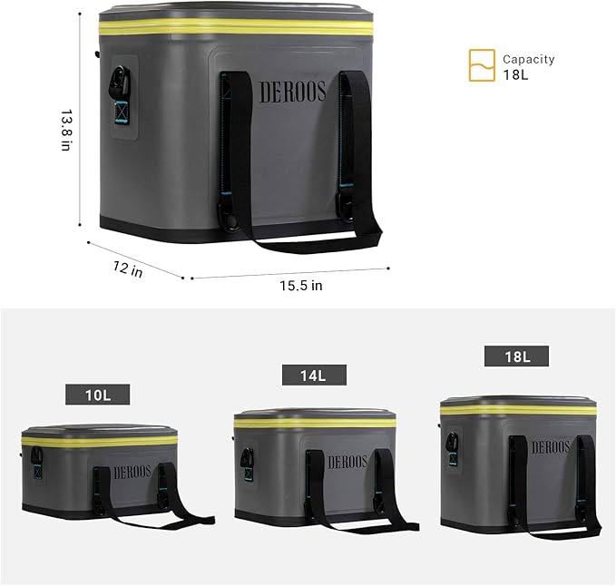 - 【LARGE CAPACITY】 DEROOS soft cooler bag is 15.5 x 12 x 13.8 inch, with a capacity of up to 35 cans plus ice, approximately 18L volume and empty weight 4.1 lbs. The cooler is small enough to carry alone but big enough to store drinks for the whole group