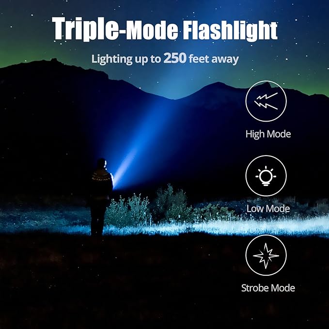 - Triple-Mode Flashlight Emergency Lighter– Cover the lid for flashlight mode: press the side button to turn ON/OFF. There are three light modes: Low light(0.4W), High light(0.9W), and Strobe light. Use low for close range, high for far range, or strobe light for warnings. The high light reaches up to 250 feet.
