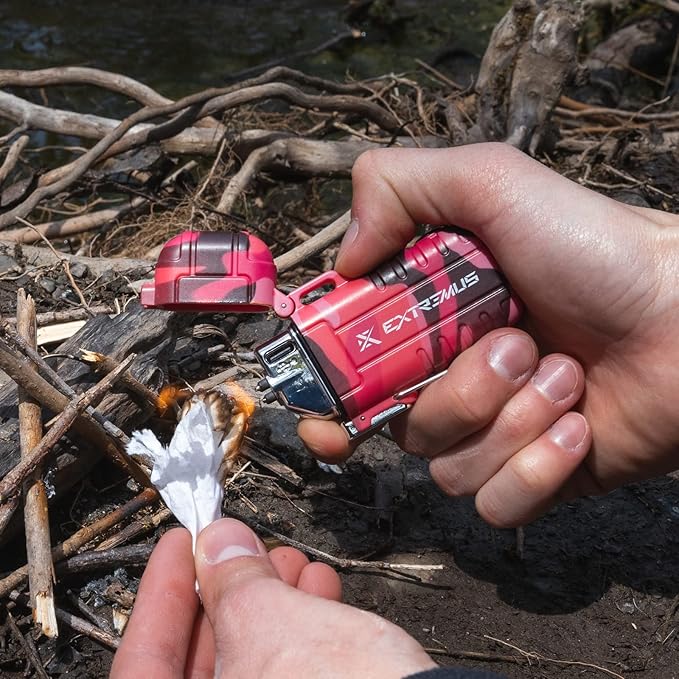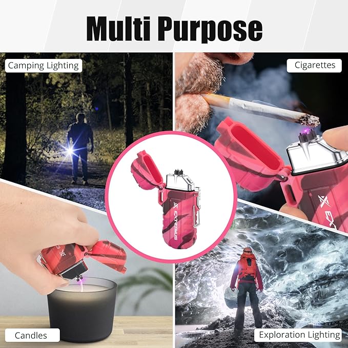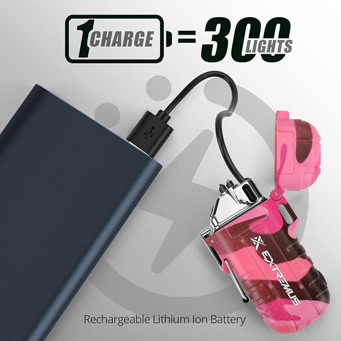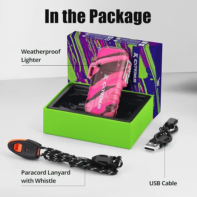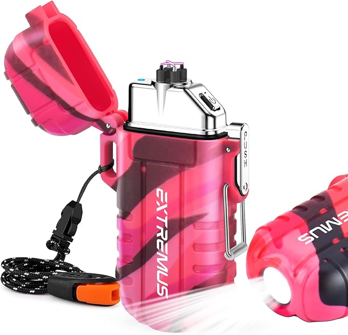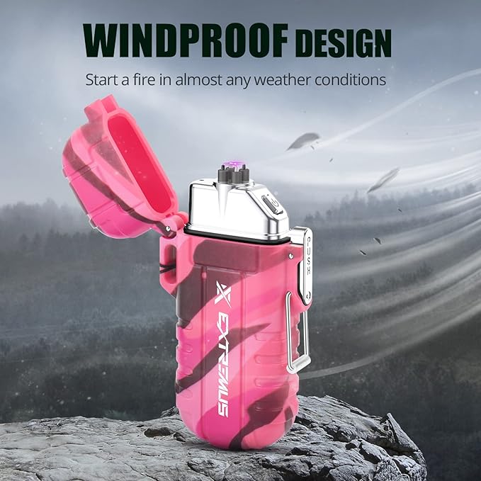 Extremus Blaze 360 Rechargeable Electric Lighters, Dual Arc Lighter, Windproof Plasma Lighter, Waterproof Lighter, Flameless Lighter with Whistle Lanyard for Camping (Pink Camouflage)