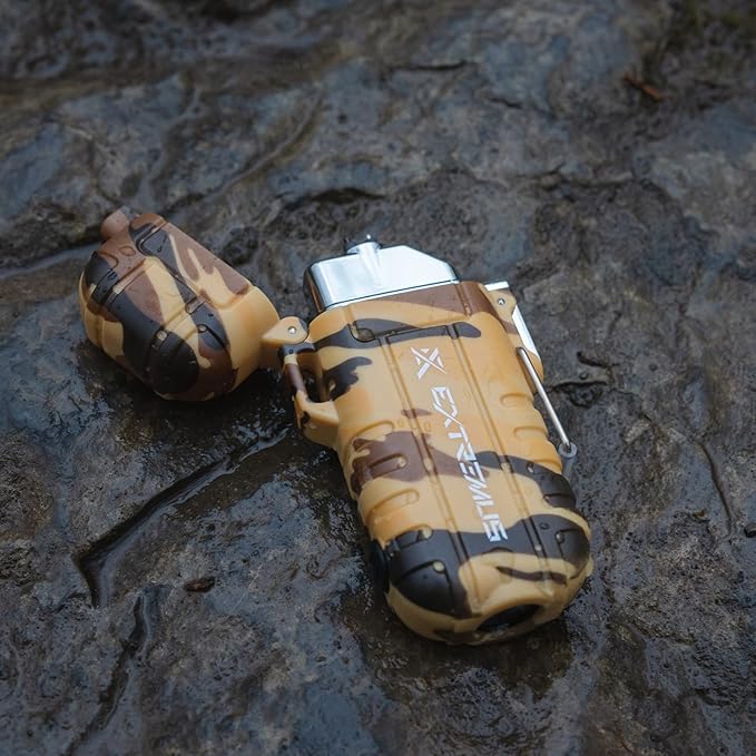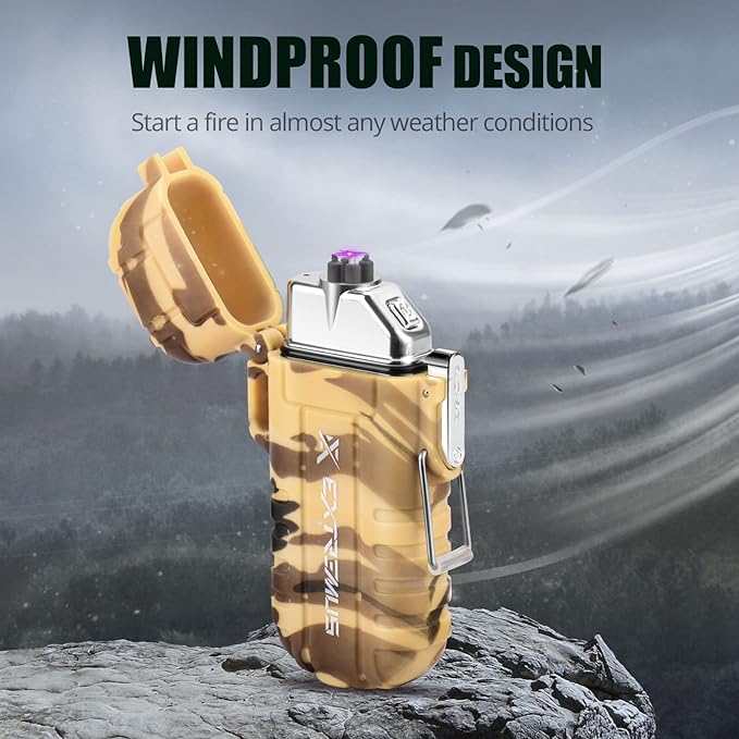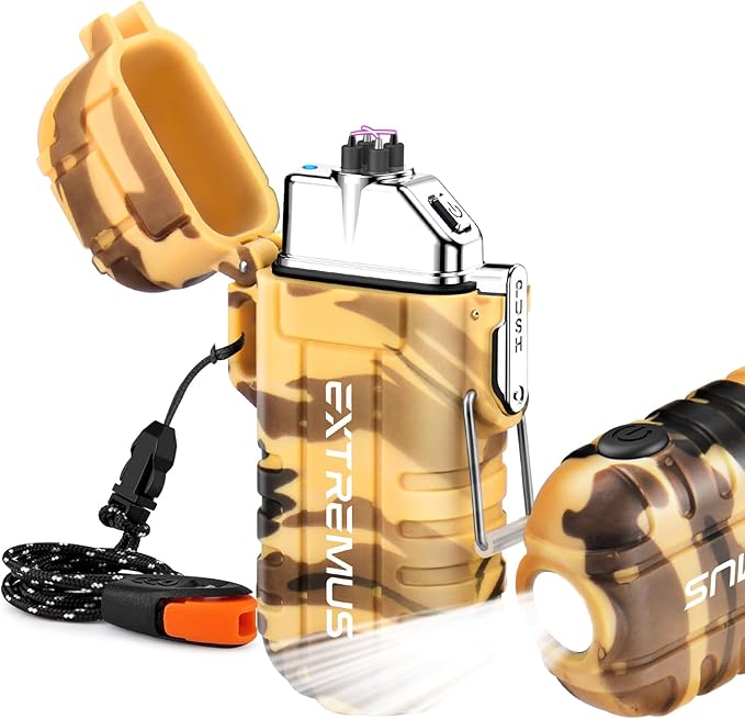 - Key Features–IP56 Dust-proof & Waterproof Lighter – Safe flameless Windproof Lighter– 3 mode flashlight camping lighter – Rechargeable lithium ion batteries – Survival whistle and lanyard