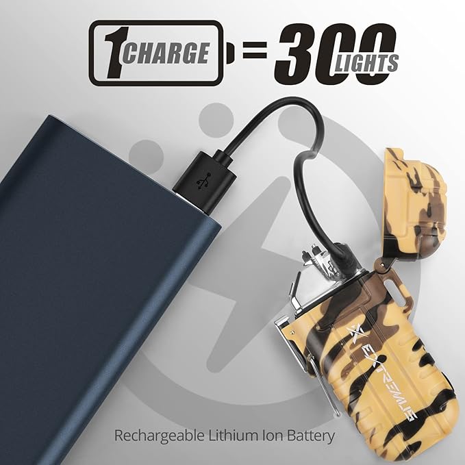 - Rechargeable Survival Lighter– The Extremus tactical lighter is powered by a rechargeable lithium ion battery that can be used up to 300 times on a single charge. Includes USB charging cord, this quick charge battery will reach a full charge in only 1.5 hours and will stay charged for up to a week.