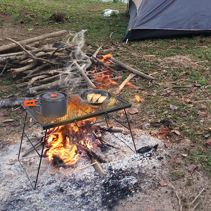 - STURDY GRILL TOP: The camping grill is designed with a steel mesh grill top which can help heat to flow through from a campfire below and accelerate the combustion.