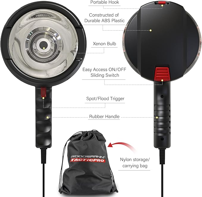 - Thoughtfully Designed Accessories - Equipped with a convenient pothook at the top and a 12V DC adapter at the bottom of the pistol-grip, this handheld light is all about practicality. Plus, we've included a durable nylon storage bag to keep your handheld light safe and ready for your next adventure.