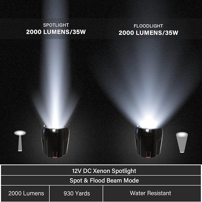 - Versatile Lighting at Your Fingertips - Enjoy the freedom to switch between spotlight and floodlight modes effortlessly with our handheld light. Simply hold the trigger on the pistol-grip, and watch as the light transforms to suit your needs. Illuminate your world like never before with our HID handheld light. Its versatility, power, and comfortable light temperature will elevate your outdoor experiences. Don't miss out on this essential tool for all your adventures