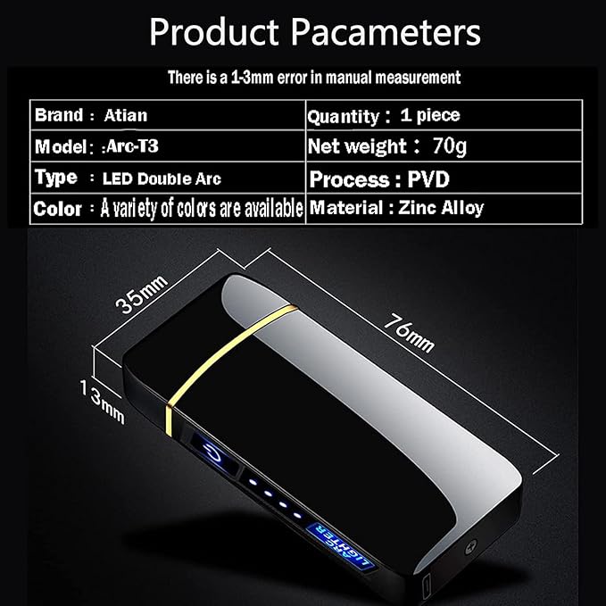 - 【What You Get】1x Touch Rechargeable arc lighter, 1x USB charging cable, 1x Packing box. This is probably a perfect gift for birthday, friends, family, lover, business and more. (Note: During the ignition, there will be the noise of “ zee, zee”, which is high-voltage power generation, please don't worry about that)