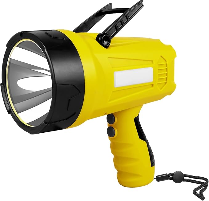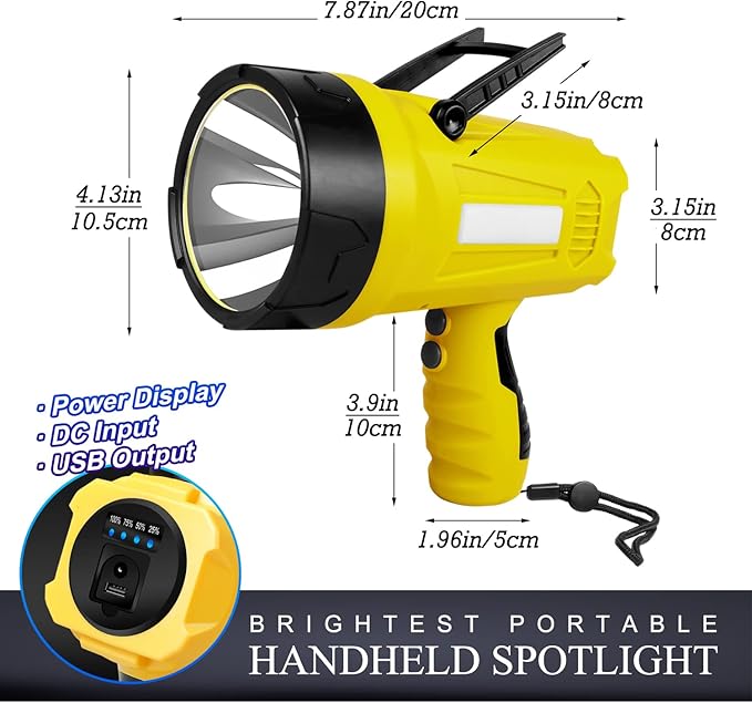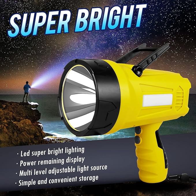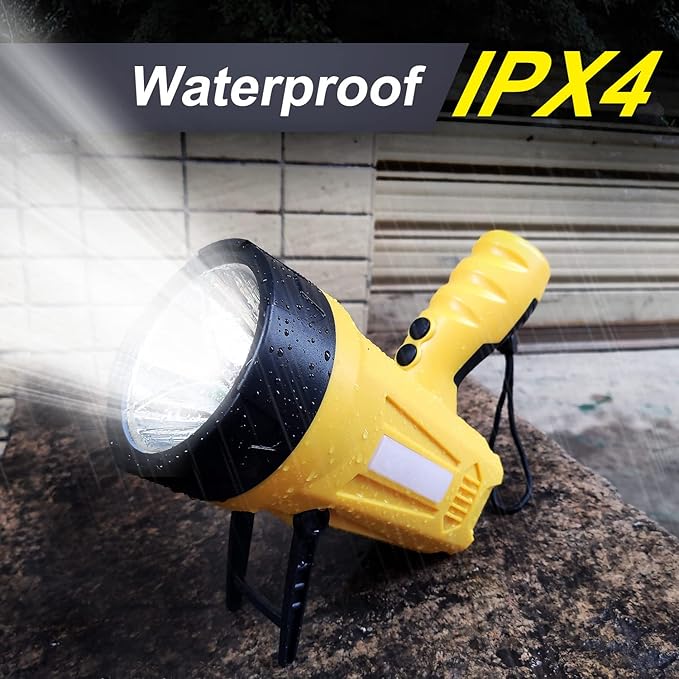 - 【IP4 Waterproof & Heat Dissipation】- The portable spotlight used impact-resistant ABS material resistance to fall off. IP4 waterproof rechargeable spotlight flashlight is able to work on high temperatures, rain, or snowy days. If you accidentally drop it in the water while hiking, camping, or hunting, no worries - floats to the surface of the water so it's easy to retrieve.