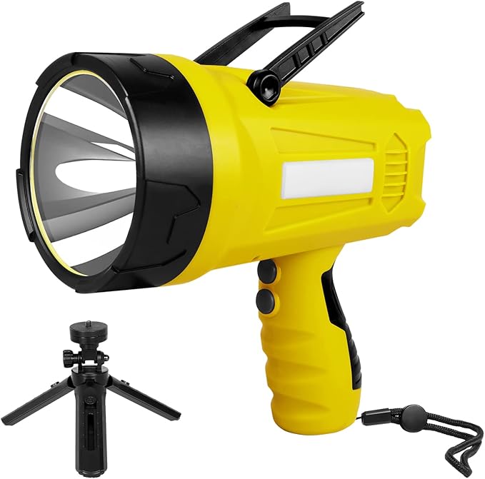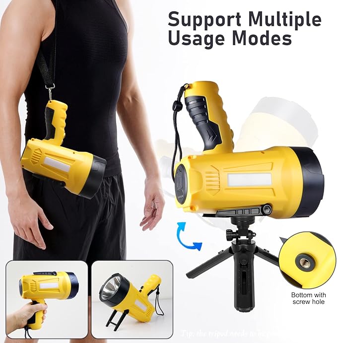 - 【Portable & Widely Used】The spotlight come with a collapsible tripod and adjustable strip, install it on the tripod and bicycle stand, or hang it on your body with the strap, perfect for use as a spotlight for hunting, car, boat, emergency, camping light, home light, etc.